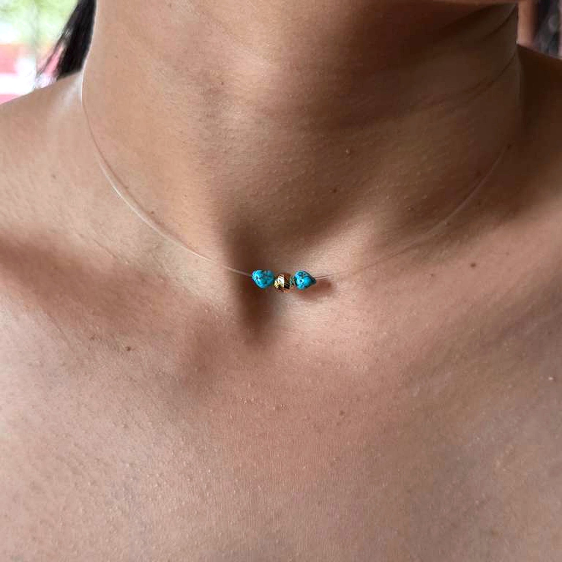 The December Invisible Necklace features natural turquoise, a gemstone admired for its vibrant blue to blue-green tone. Its surface may display subtle natural veining, known as matrix, which reflects its authentic formation and makes each stone unique.