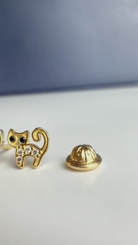 Kitty Stud Earrings – 6mm Gold Cat Earrings with Black & White Zircon